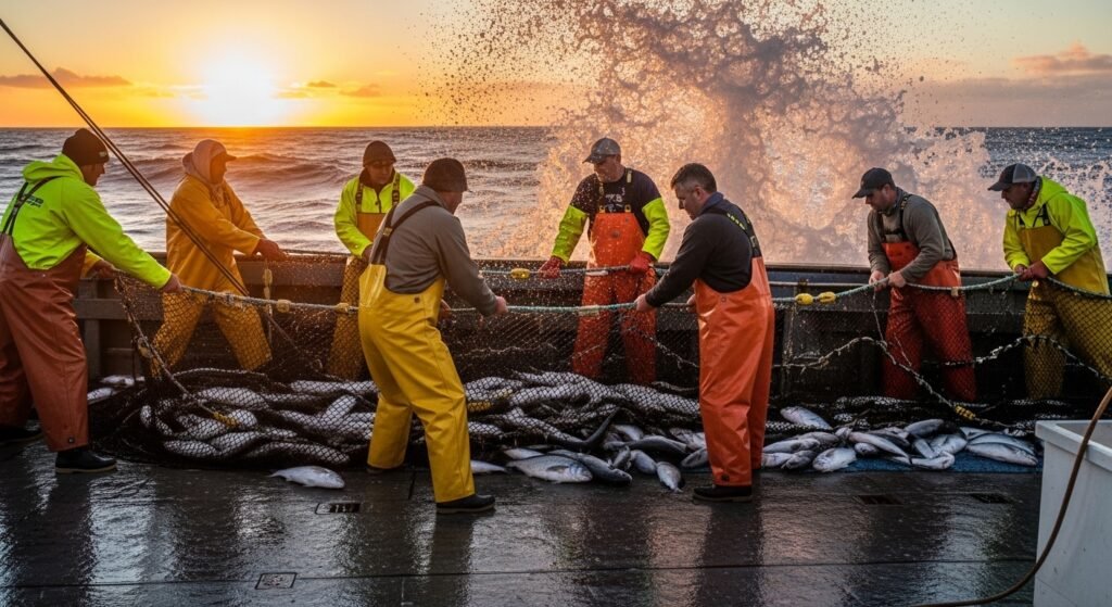Commercial fishermen spend long periods at sea facing rough waters and unpredictable weather. Work begins before sunrise and can last many exhausting hours. Physical endurance, teamwork and strong navigation skills are essential for success offshore.