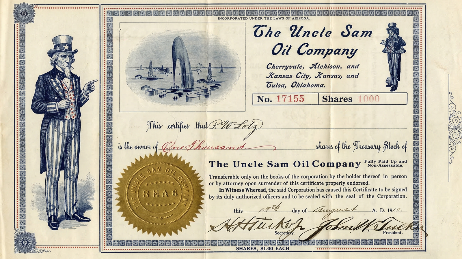 Uncle Sam Oil was started by Henry Harrison Tucker Jr. as a consciously patriotic brand. The decision to name the company after one of the most iconic symbols of the United States of America was a strategic one and aimed at capturing the interest of ordinary investors who thought that they were helping to develop healthy competition on the free market against a major monopoly.