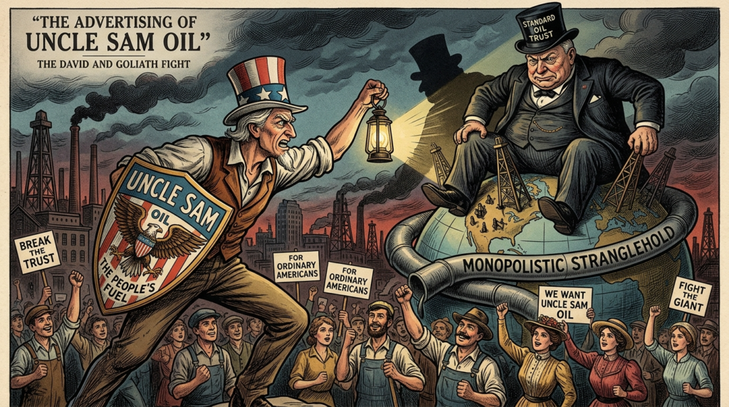 Advertising had placed Uncle Sam Oil as a snarling underdog that was working on behalf of ordinary Americans. The David-versus-Goliath tale appealed to the masses, who were already highly suspicious of the suffocating monopolistic stranglehold of the Standard Oil on the energy supply of the entire nation.